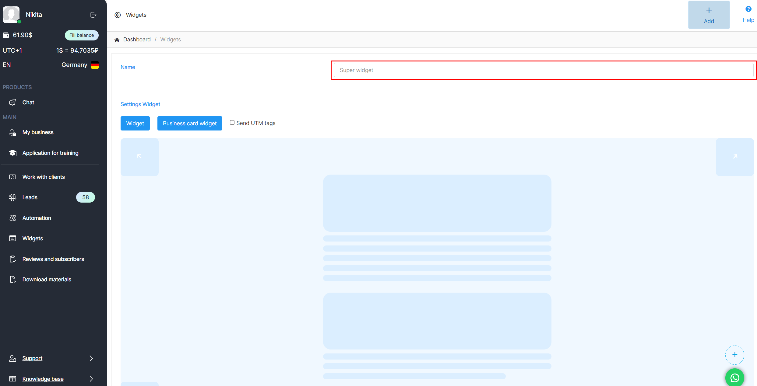 3. Enter widget name in the input field. This name will be displayed in the list of widgets in the Personal Account and is needed for orientation if you have added several widgets to different sites.