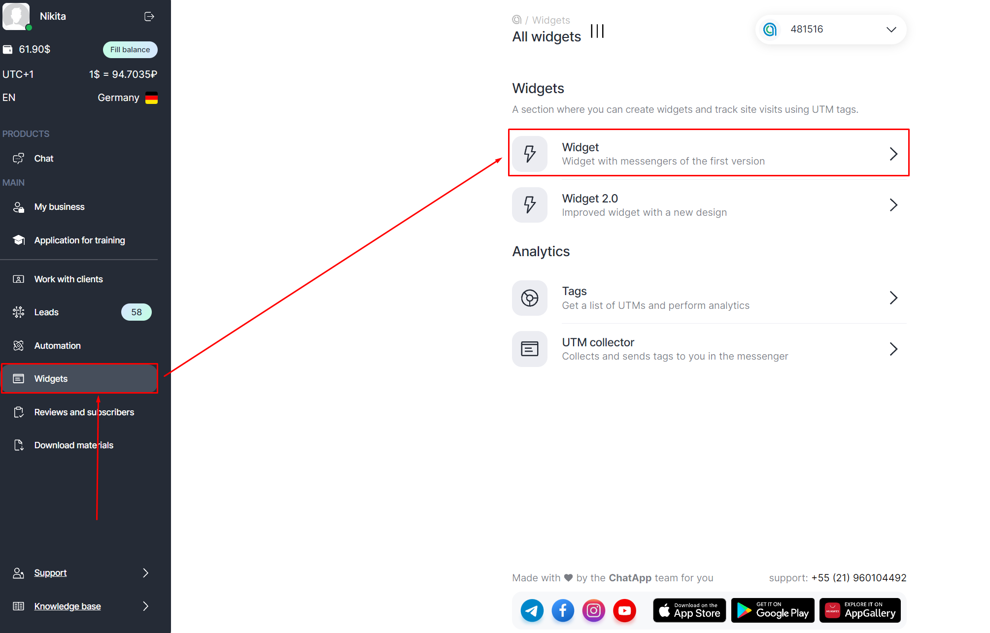 1️. In the ChatApp Personal account, select “Widgets” in the left side menu, and select “Widget”.