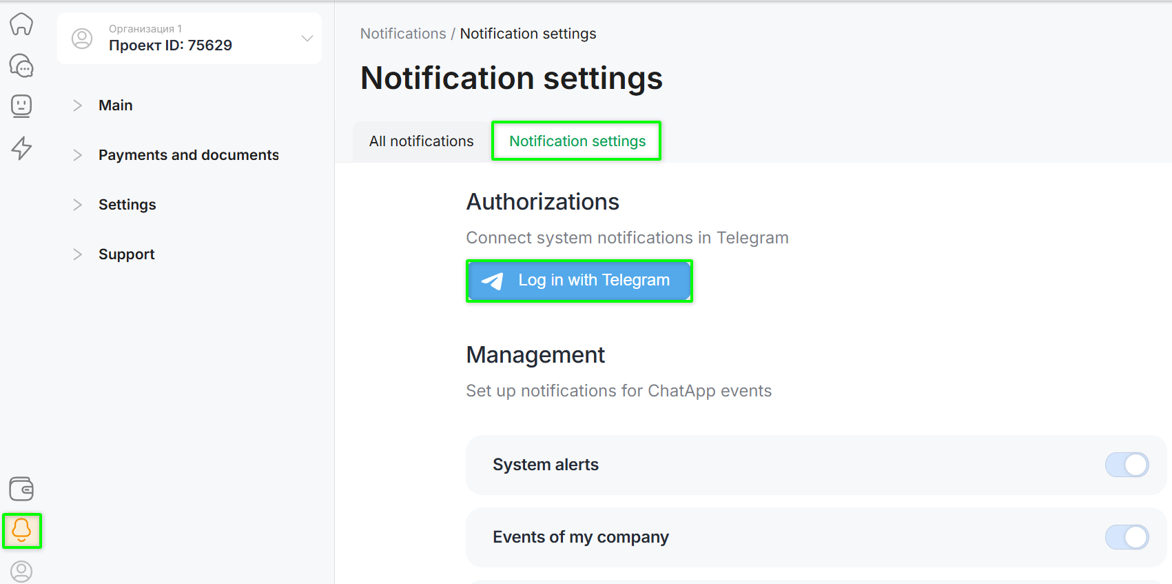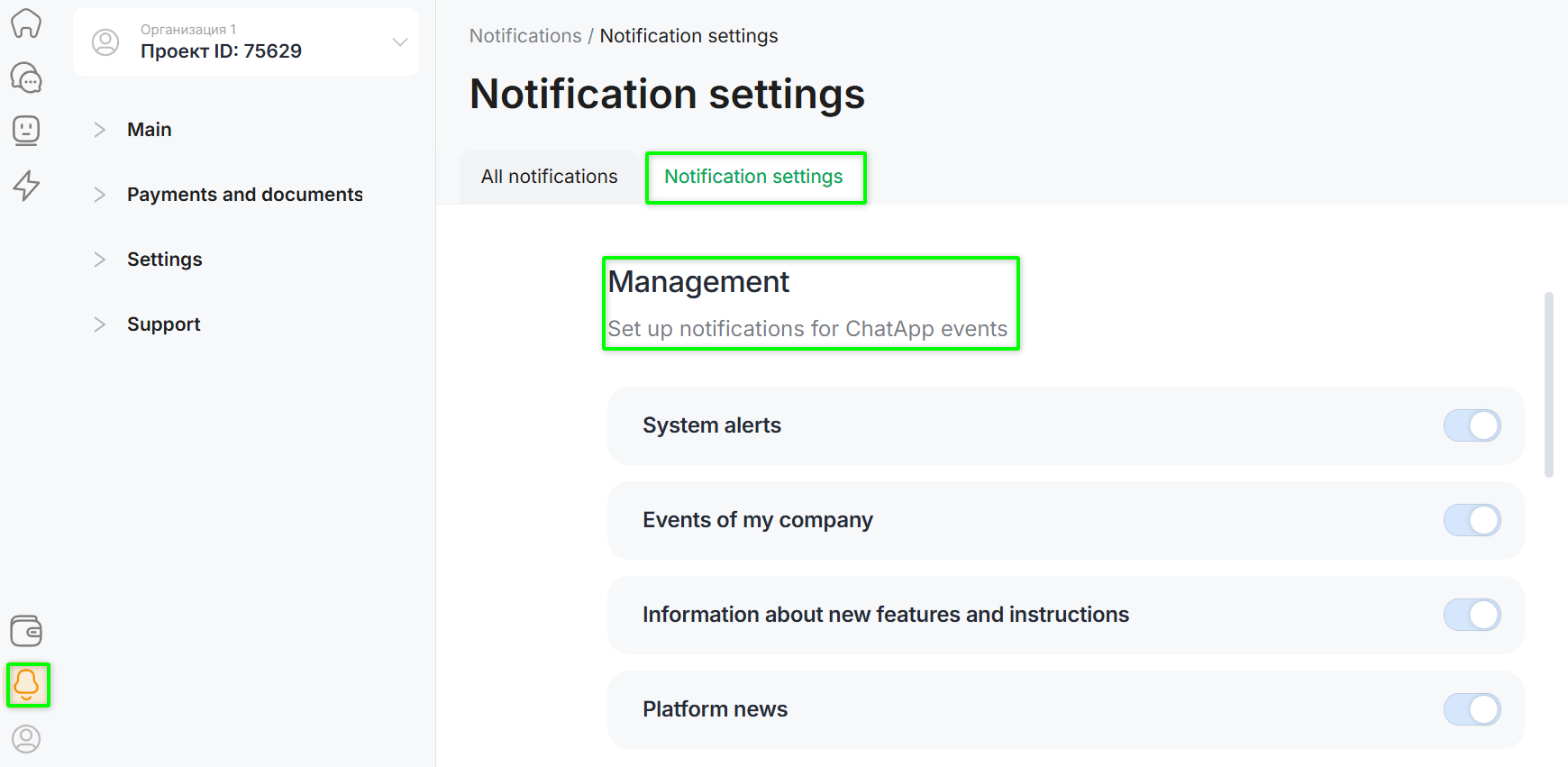 - ChatApp personal cabinet (bell) — cannot be disabled;