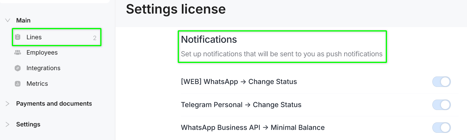 Enable Telegram notifications to receive alerts related to specific lines.