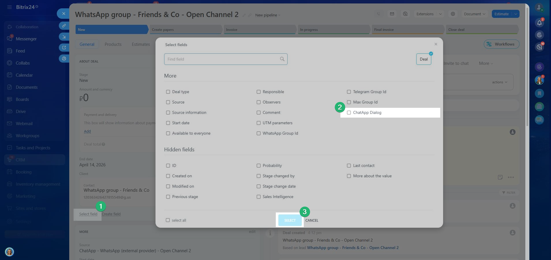 Step 3. Click “Select field” and check the box next to the ChatApp Dialog field → click “Select” to save the changes.