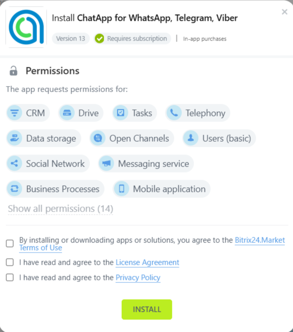 To continue working with the service, you need to connect ChatApp channels to Bitrix24 Open Line. Learn how to do this in the article “Connecting channels“.