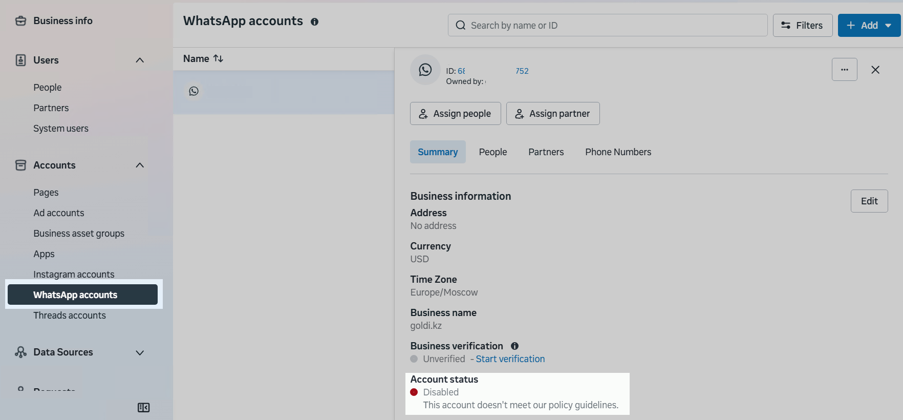 If an account is blocked, one of the following statuses appears in Meta Business Suite in the company settings at:
