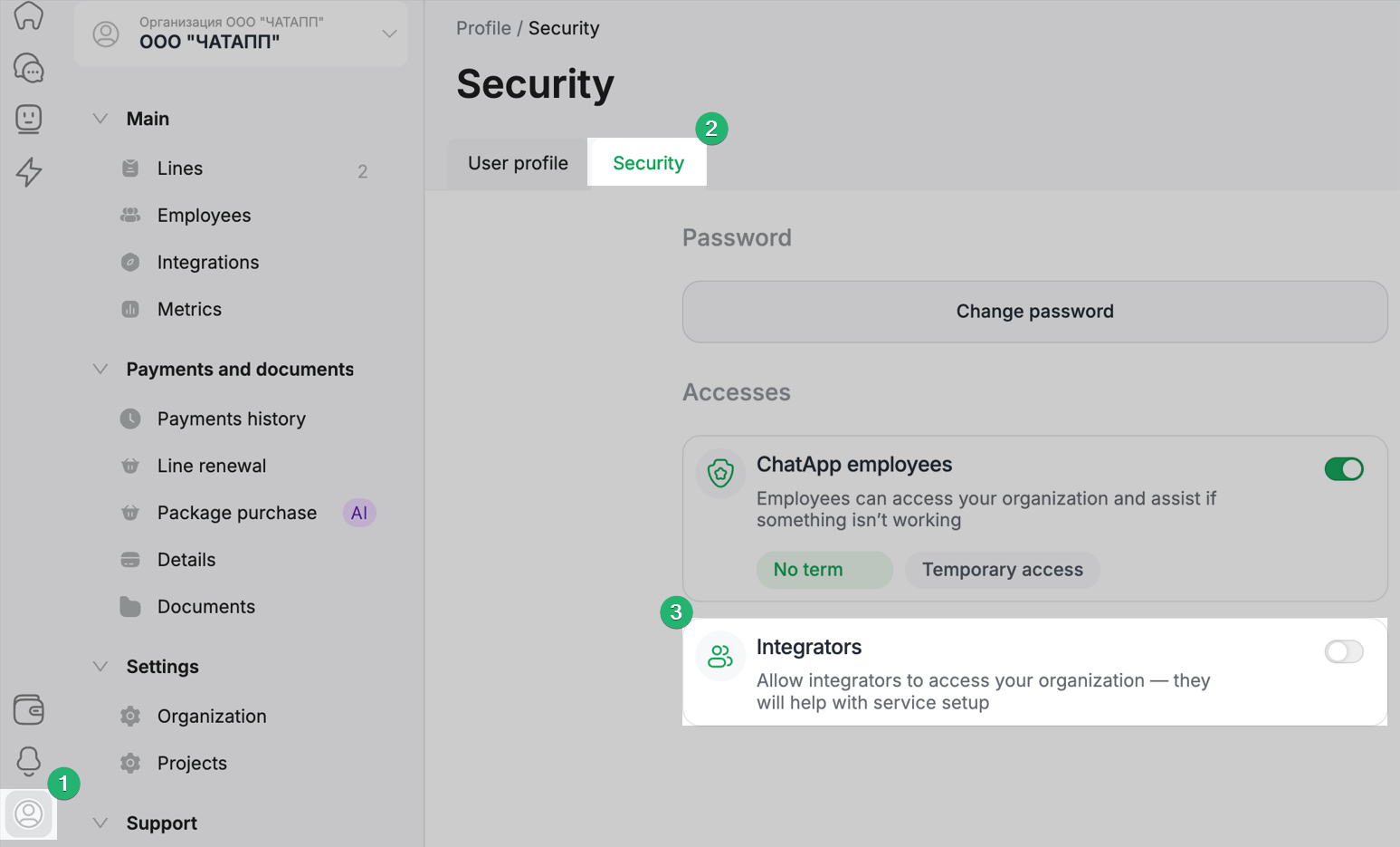 If you are working with an integrator, they may request access to your personal account. After access is granted, the integrator will be able to view information and perform the necessary actions in your ChatApp account.