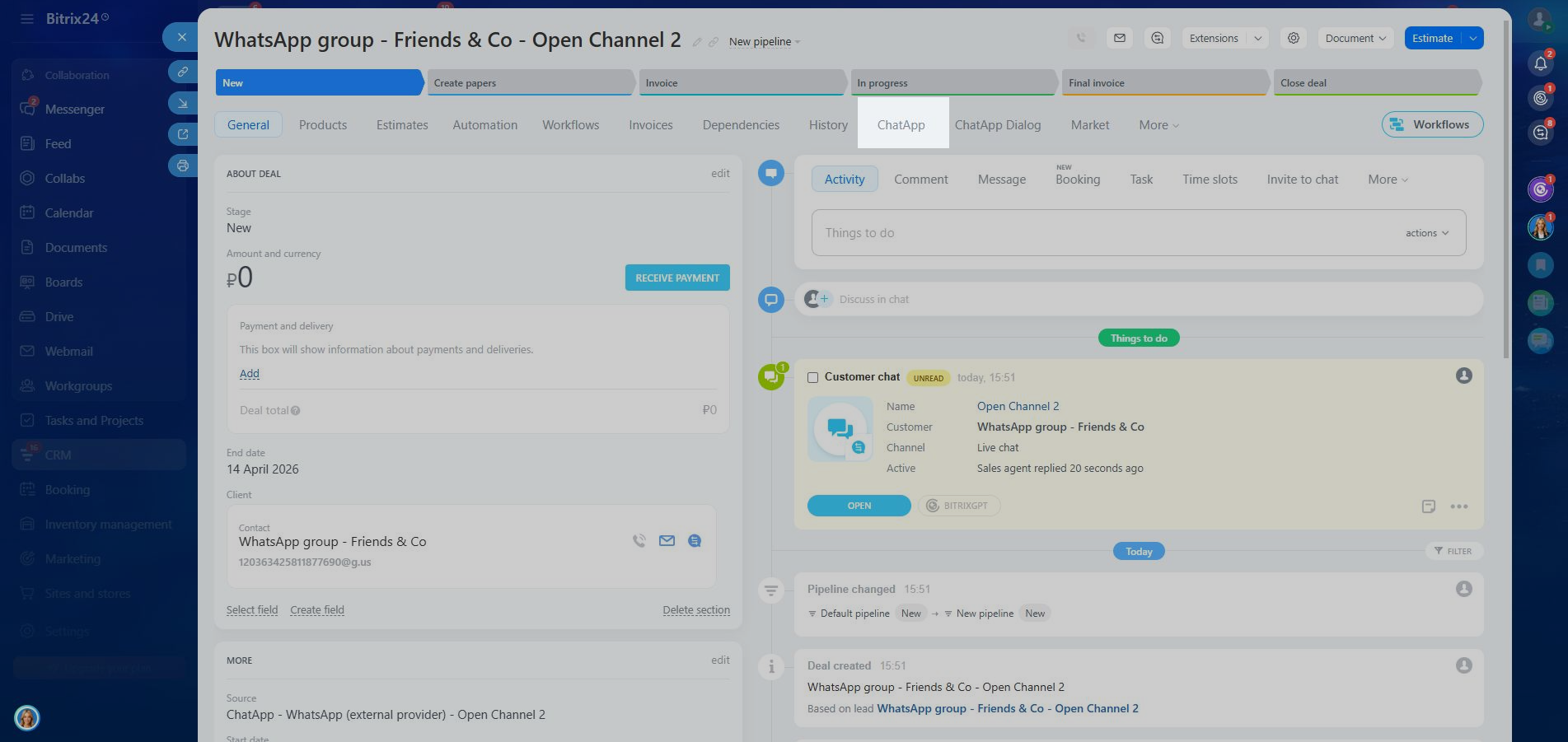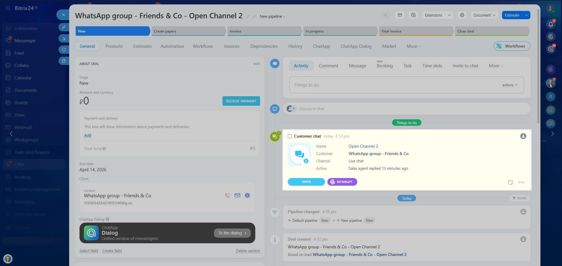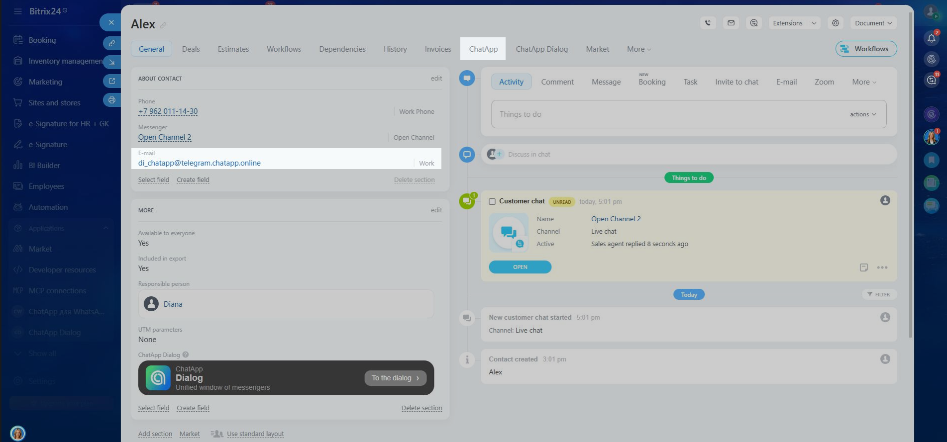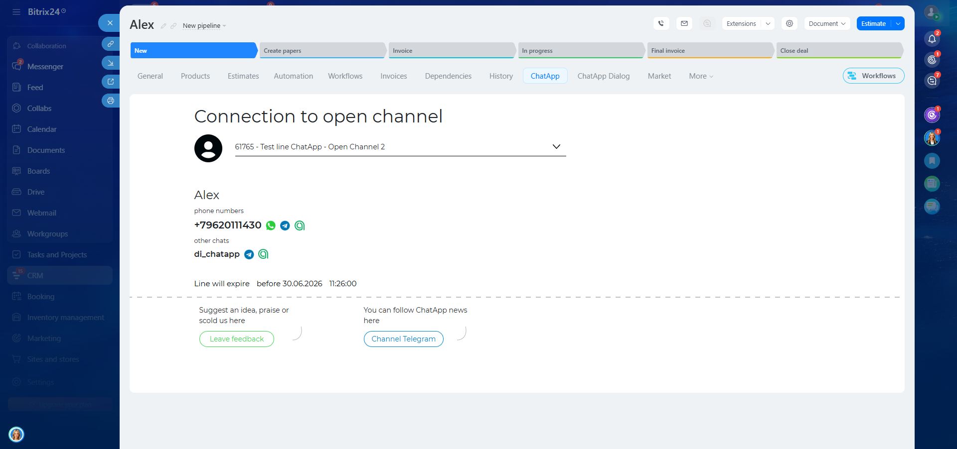 If you use Bitrix24 Open Channel chats, you can start a conversation with a client directly from the CRM card. How to set up Open Channels — read the article.