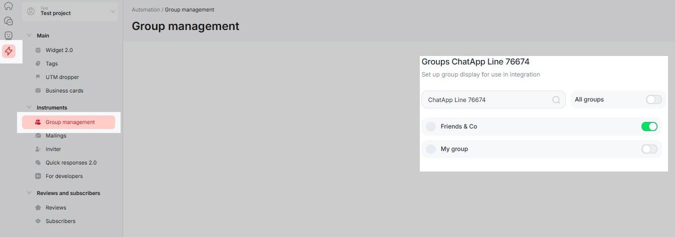 Step 1. In the ChatApp account, go to “Automation” → “Group Management” → select the line → make sure the group is enabled.