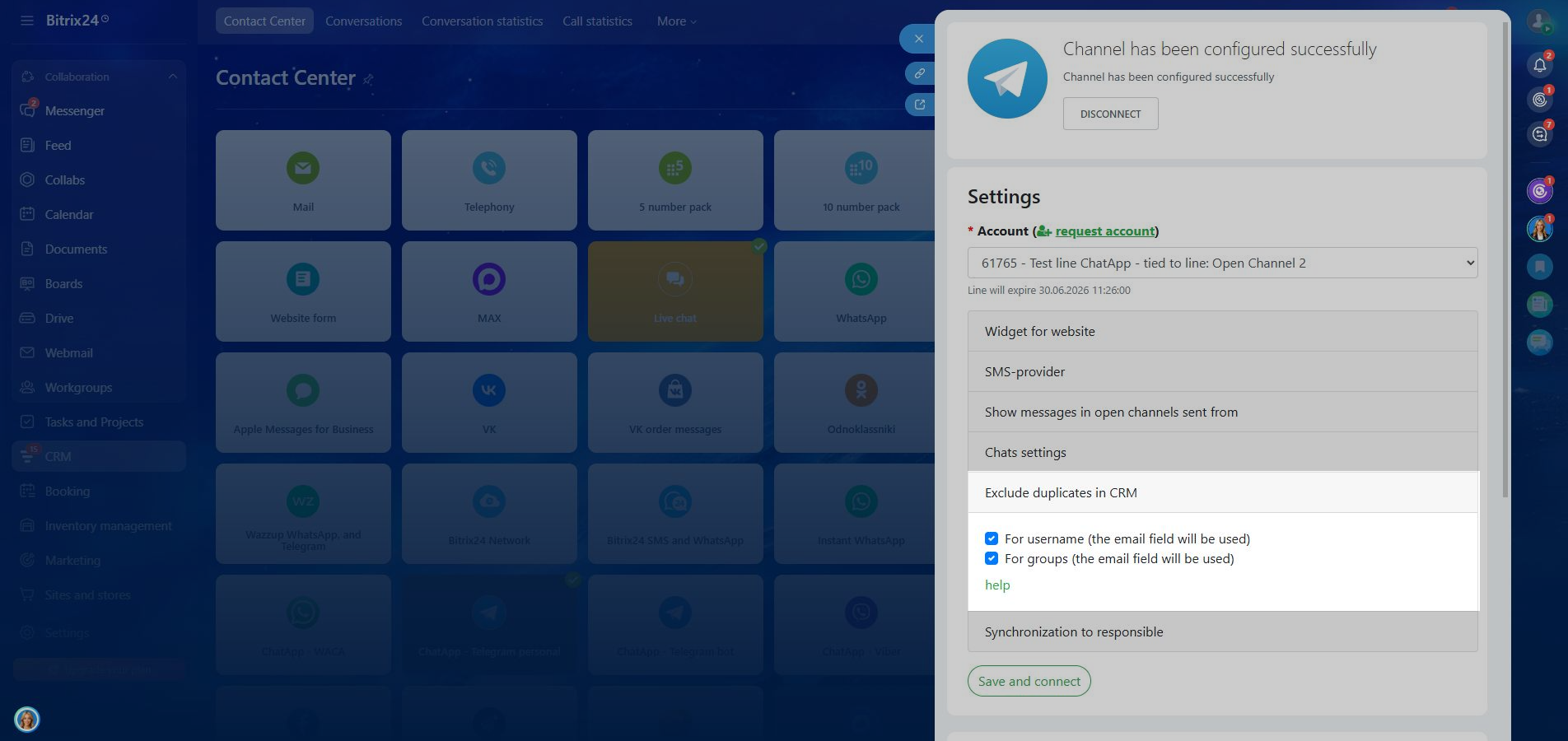 Step 2. Go to the ChatApp-Telegram connector settings and make sure the parameter is enabled: “Exclude CRM duplicates” → “For username”.