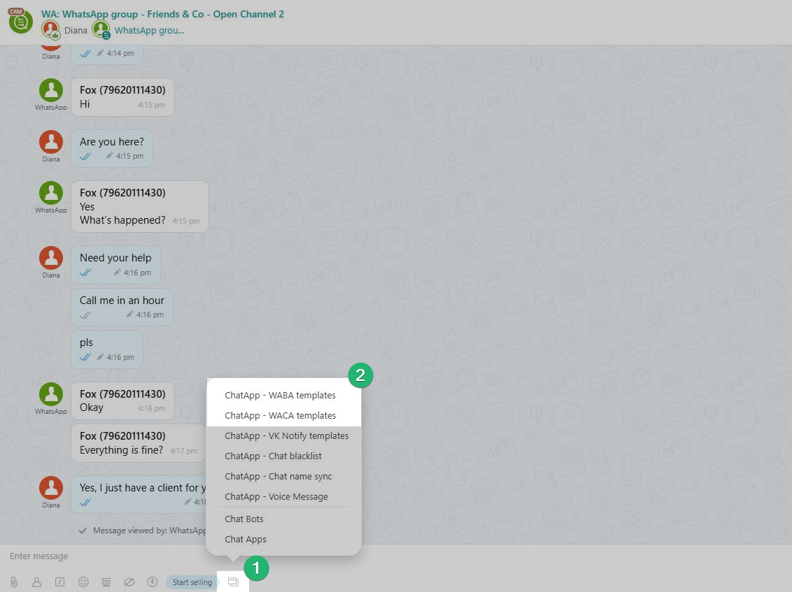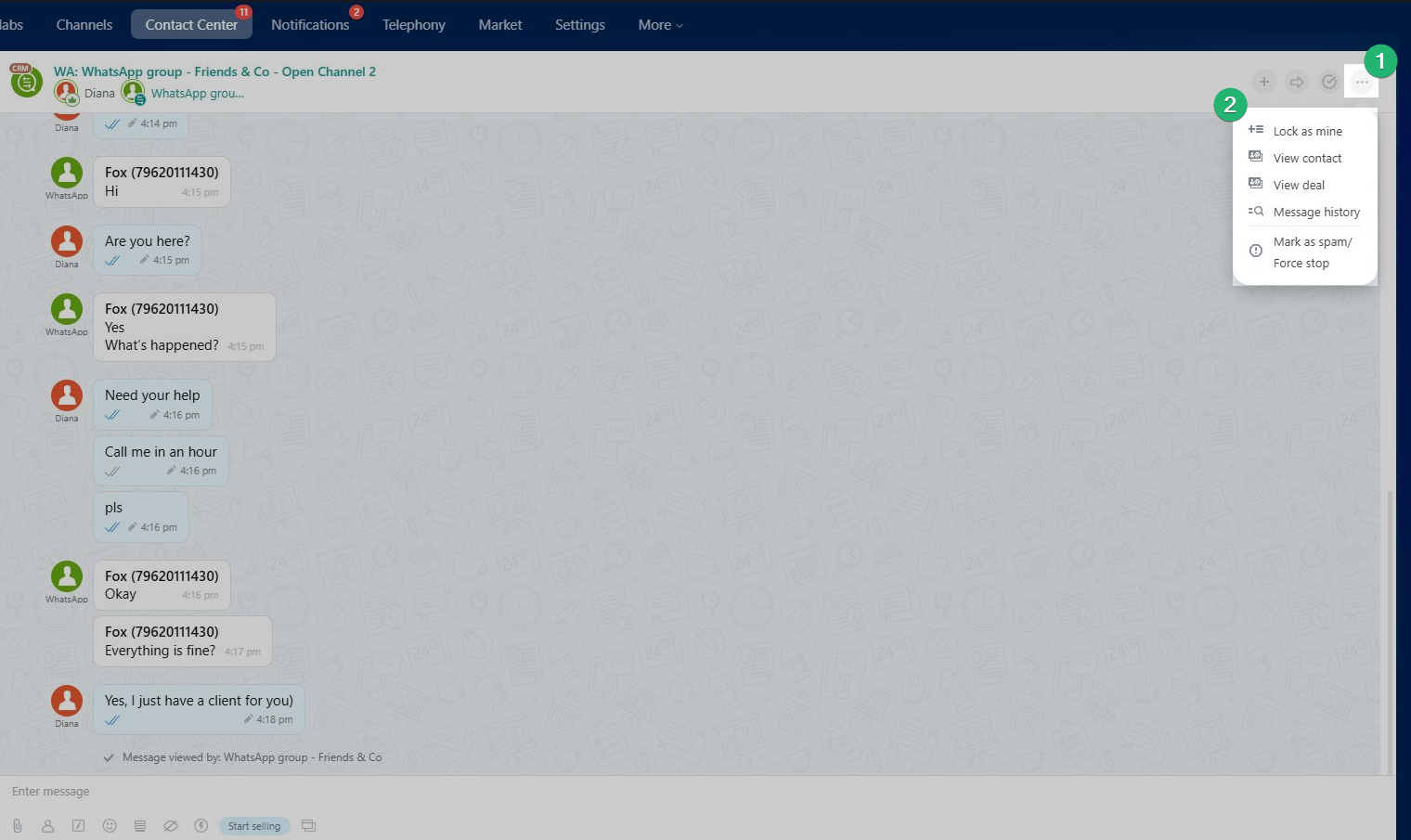 In this window, click the icon of the desired messenger — you will be redirected to the chat with the client in Open Channels, where you can start the conversation.