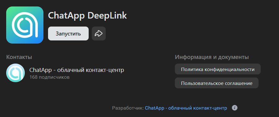 1. Установите приложение для Вконтакте по ссылке — ChatApp DeepLink. Аккаунт должен быть привязан к странице сообщества.