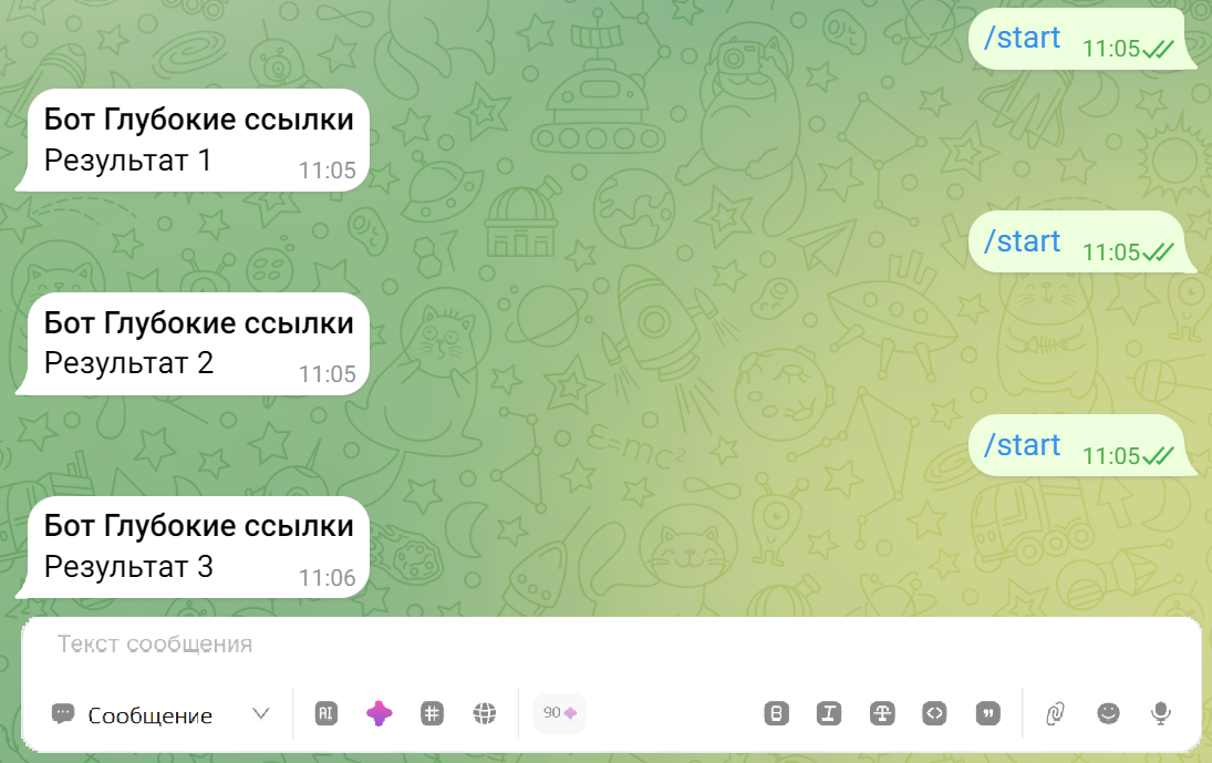 Также глубокая ссылка может вести на один из сценариев бота — подробнее об этом читайте в статье «Стартовый блок«.