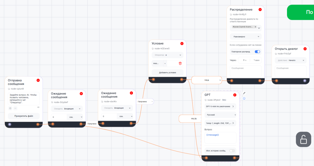 Сценарий на скриншоте цикличен и ChatGPT будет отвечать на сообщения, пока клиент не позовет оператора.