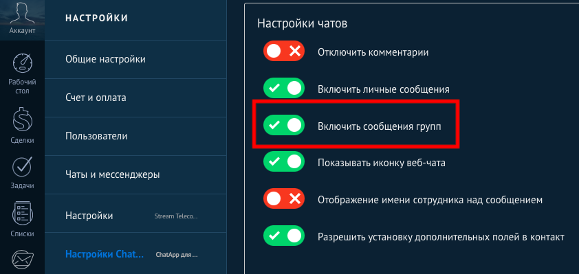 Групповой чат из Telegram, WhatsApp и других мессенджеров создается в специальной карточке CRM, что позволяет пользоваться этой карточкой как чатом отдельной группы.