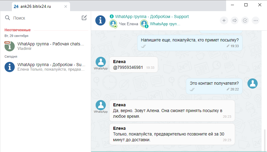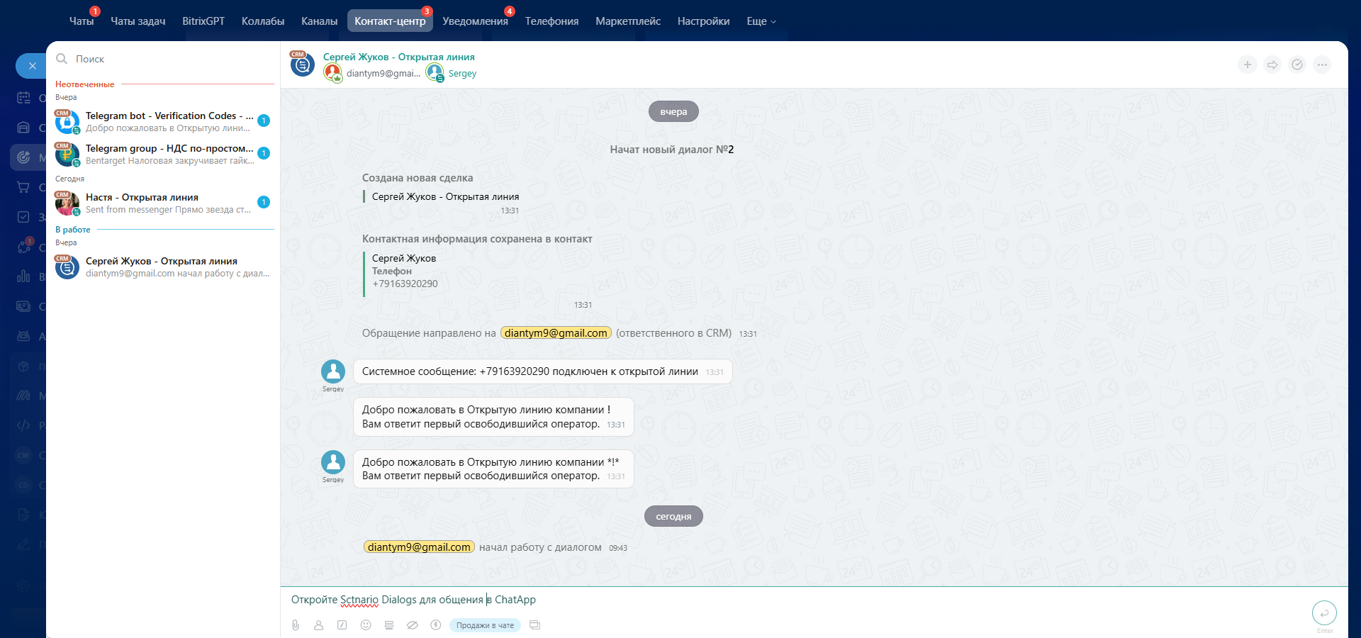 Чтобы начать общаться с группой в CRM, необходимо дождаться первого сообщение после того как ваш номер стал участником группы. После этого группа появится в Открытых линиях.