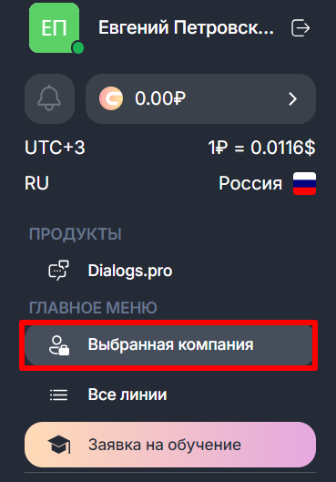 1. Слева в меню перейдите в раздел «Выбранная компания».