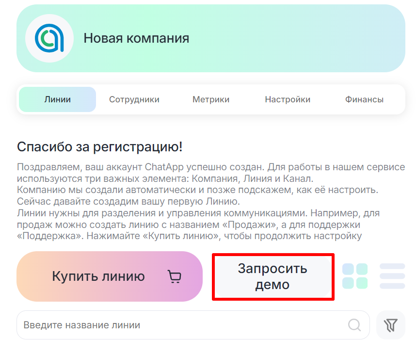 С DEMO линией появляется доступ к Личному кабинету ChatApp на 3 дня.