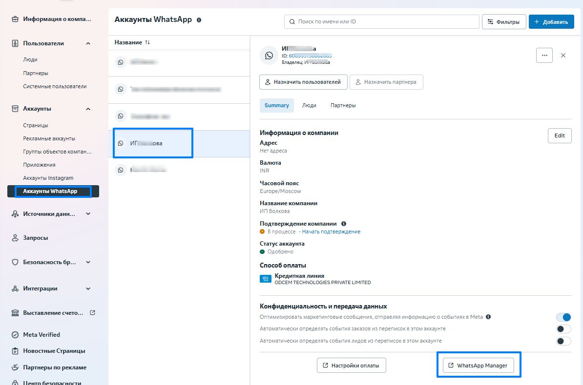 1. Перейдите в «Аккаунты WhatsApp», выберите нужный аккаунт и нажмите «WhatsApp Manager» в правом нижнем углу.