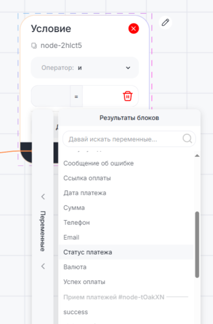 3. Чтобы отправить клиенту информацию о платеже, добавьте блок «Условие» и вставьте нужный результат блока «Информация о платеже», например, «Успех оплаты».