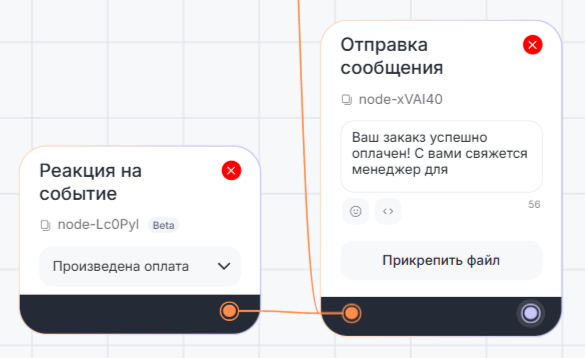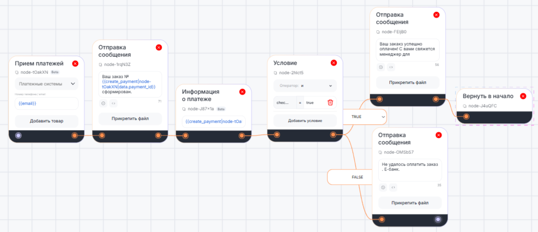 Если результат «true», то можно добавить блок «Отправка сообщения» с уведомлением о успешной оплате. Если «false», то уведомление о том, что оплата не прошла.