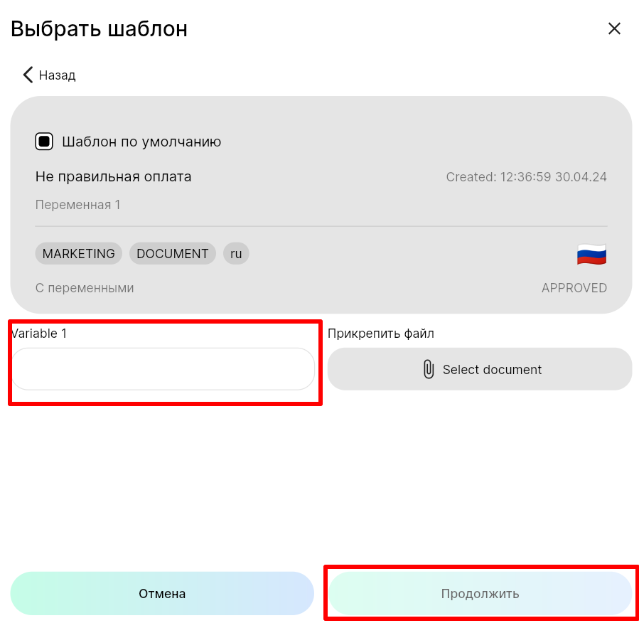 9. Если присутствуют переменные, заполните их и нажмите «Продолжить».