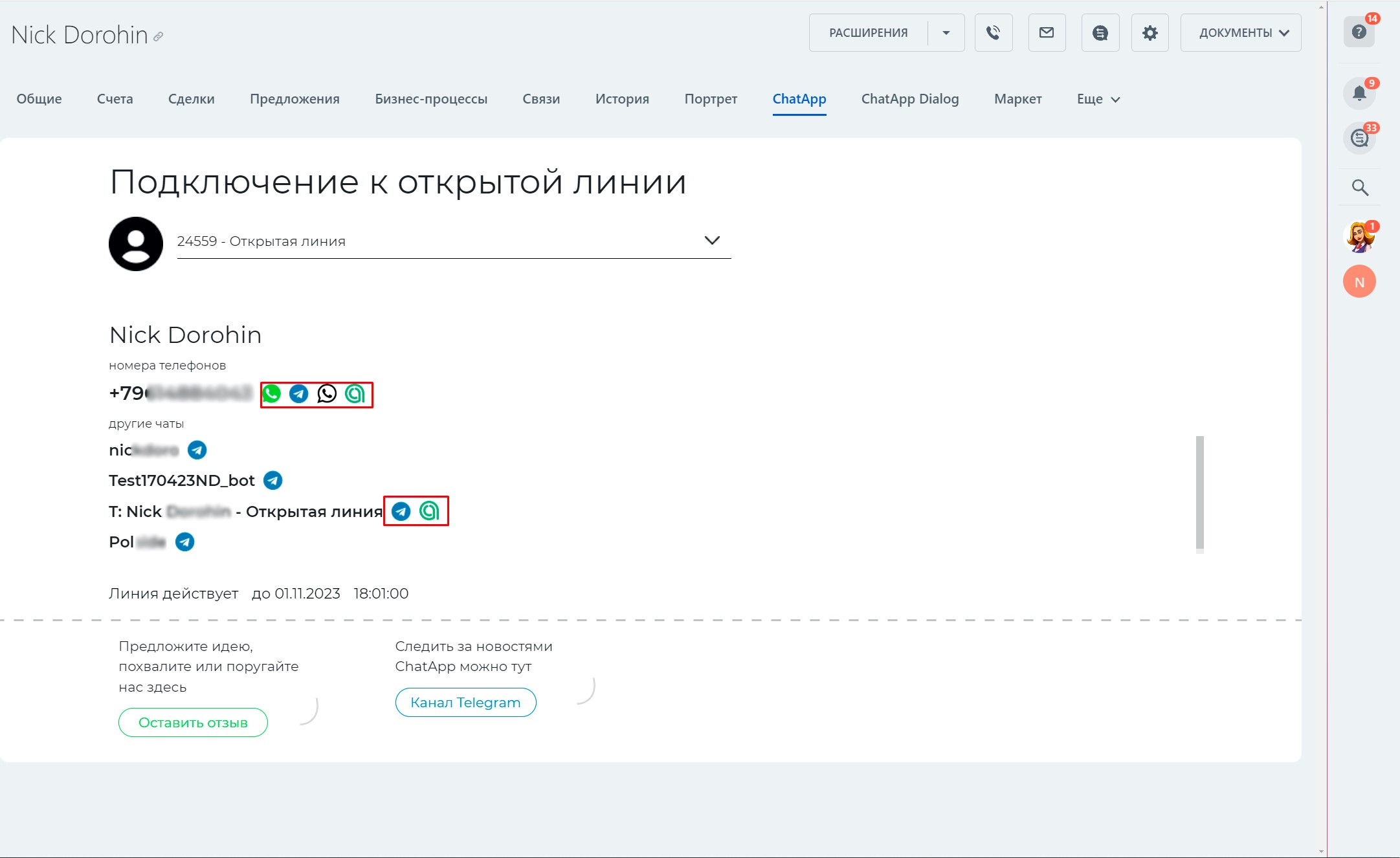 Важно: иконка мессенджера активна, если контакт внесен в карточку CRM, а канал мессенджера