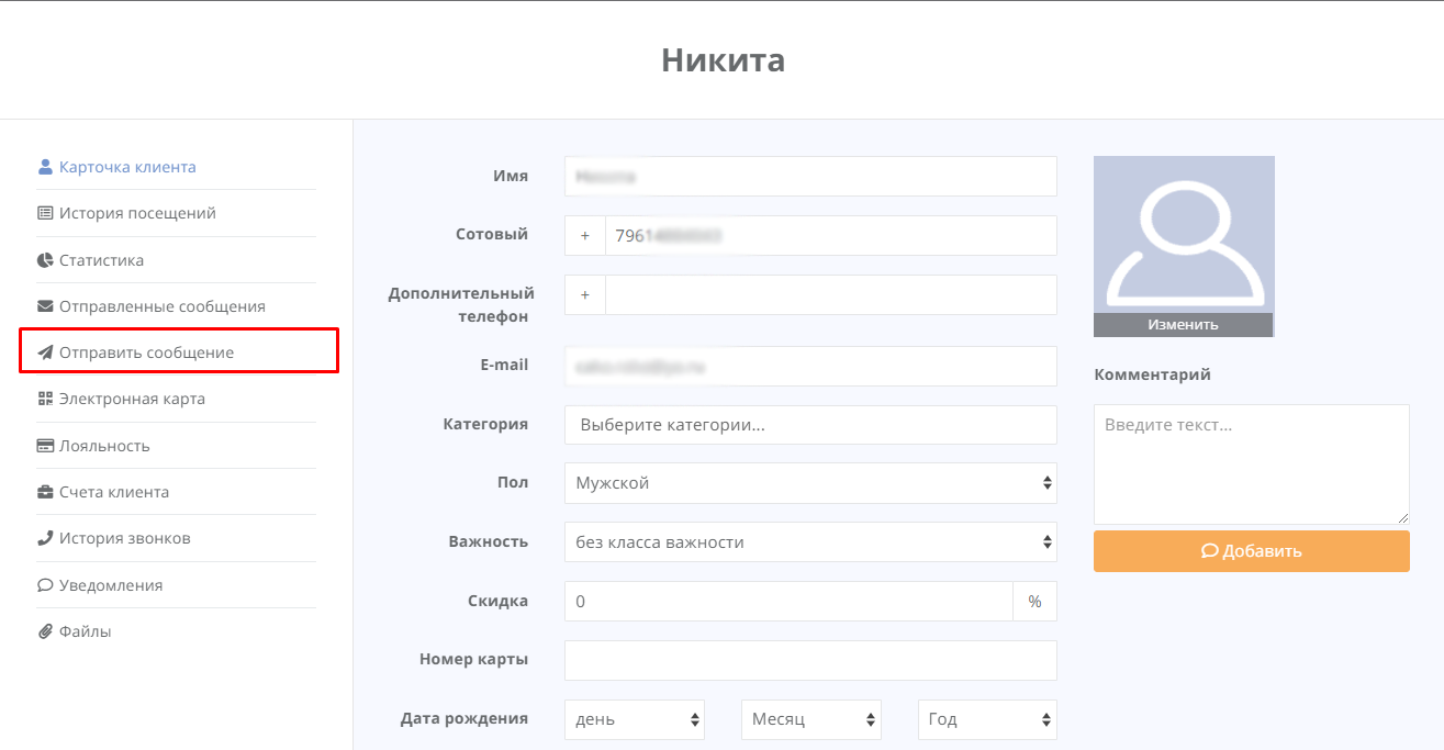 3. Выберите клиента в открывшейся карточке и нажмите «Отправить сообщение».