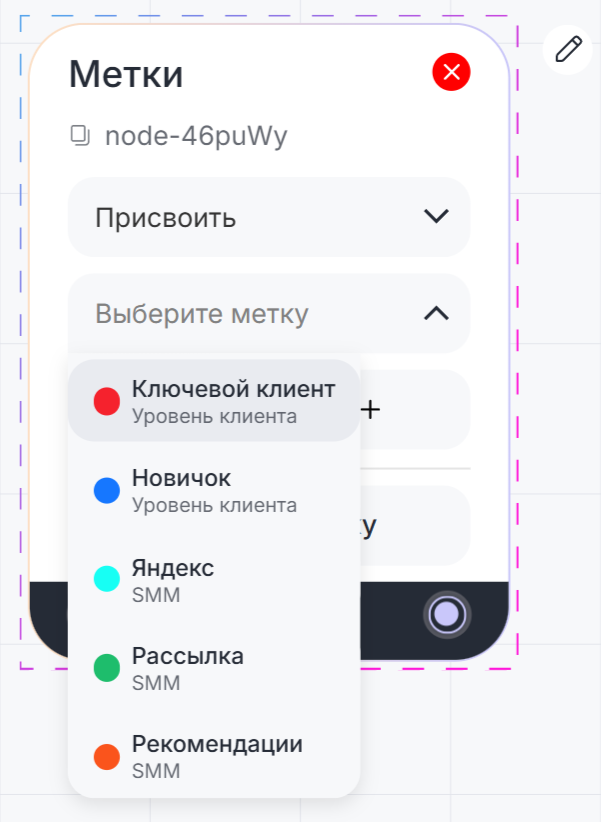 Блок «Метки» можно расположить в любом сценарии взаимодействия с клиентами.