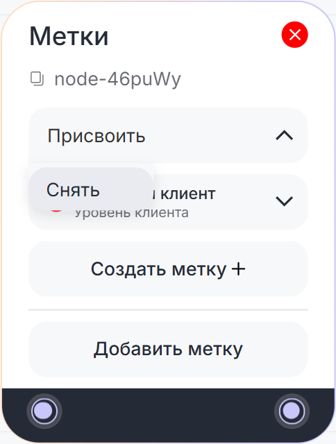 Когда запущенный сценарий доходит до блока «Метки», в зависимости от настроек блока диалогу присваиваются либо снимаются указанные метки.