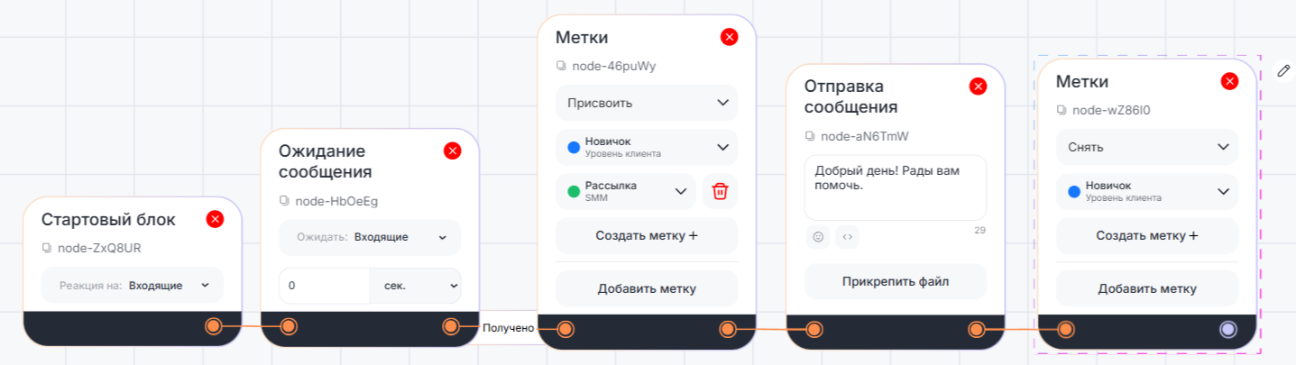 В приведенном ниже примере сценария после сообщения клиента блок автоматически присвоит диалогу выбранные метки. Далее в диалог отправится сообщение и блок снимет метку «Новичок».