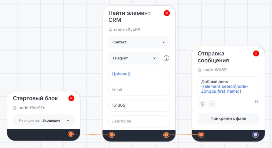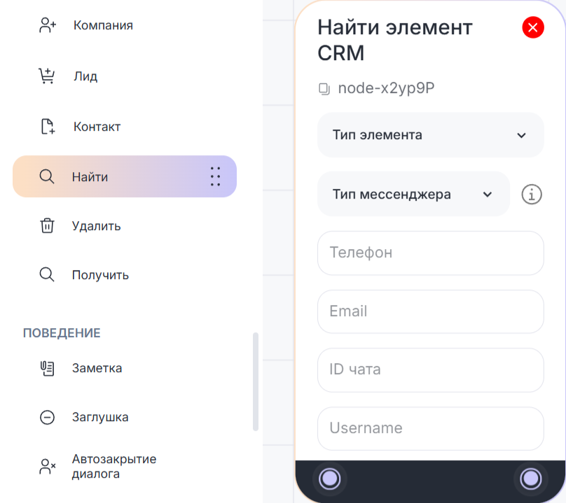 В диалоге бота с клиентом блок «Найти элемент CRM» автоматически найдёт элемент в CRM-системе.
