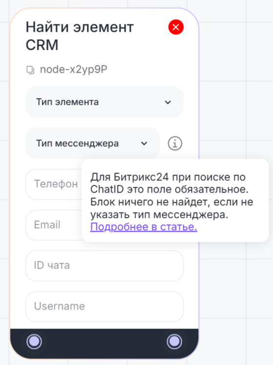 3. Введите значение, по которому будет происходить поиск элемента в CRM — Телефон, Email, ID чата или Username. В поле можно ввести переменную. Можно заполнить несколько полей.