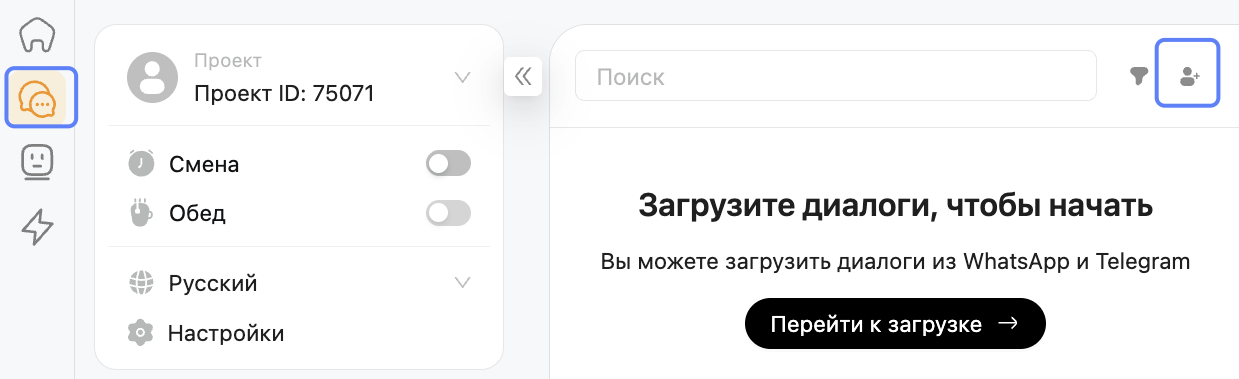 Шаг 1. Нажмите кнопку «Добавить диалог». Вы можете создать личный чат с клиентом или групповой чат. Нажмите «Новый диалог».
