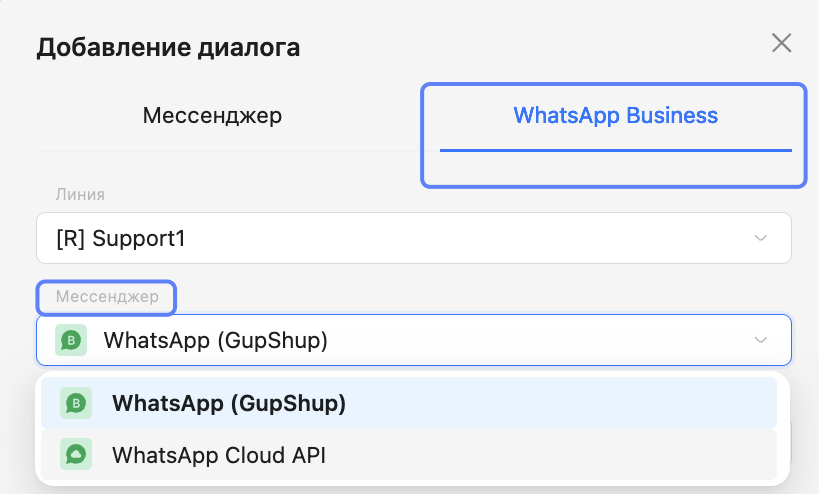 Затем укажите тип канала: WhatsApp Business API или WhatsApp Cloud API.
