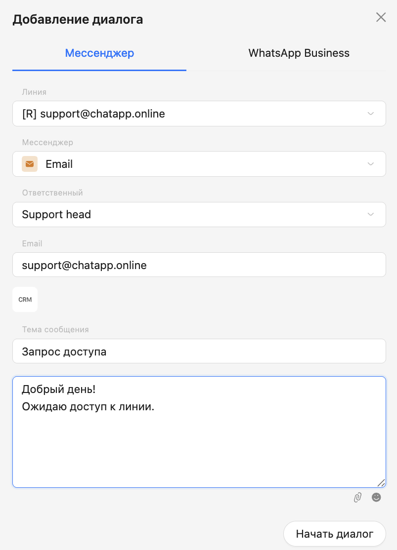 Шаг 7. Нажмите «Начать диалог» — чат с клиентом откроется, а отправленное сообщение отобразится в диалоге.