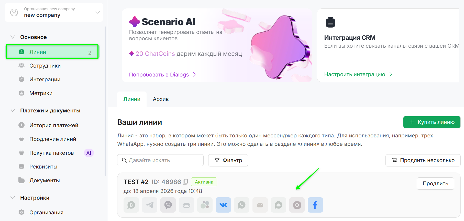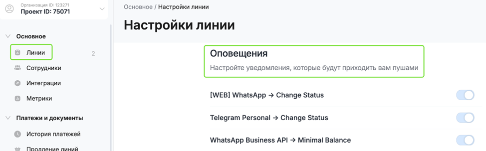 Линия — это сущность, объединяющая набор каналов мессенджеров и связанные с ними настройки.