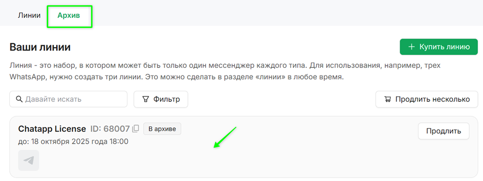 При необходимости вы можете вручную архивировать линию, если она временно не используется и не должна отображаться в общем списке.