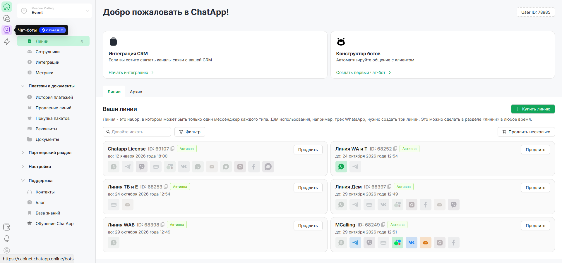 5. В разделе «Мессенджеры» выберите каналы, по которым будет работать ваш бот. Вы можете ограничить работу этого бота определенными линиями. Для этого подберите нужные линии в поле «Добавить линию».