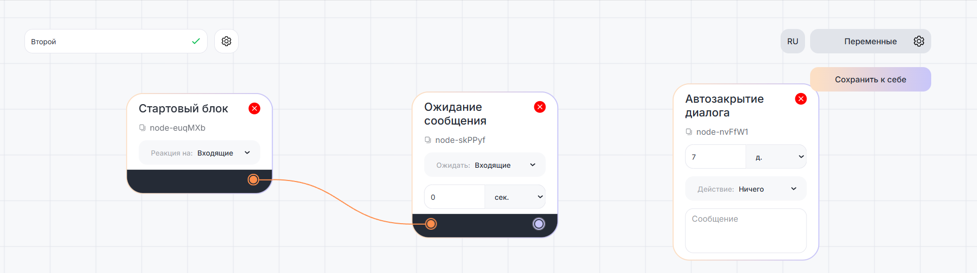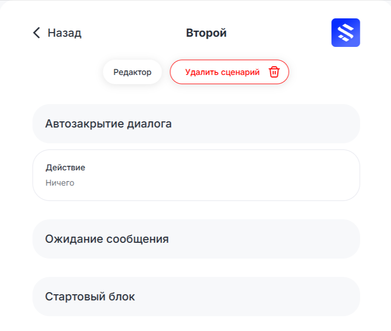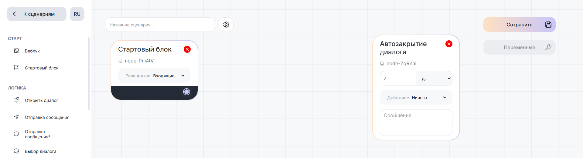 Блоки «Поведение» — самодостаточные. Их не нужно связывать с другими. Если блоки «Автозакрытие диалога» и «Нерабочее время» находятся в рабочей области, они влияют на весь сценарий в целом.