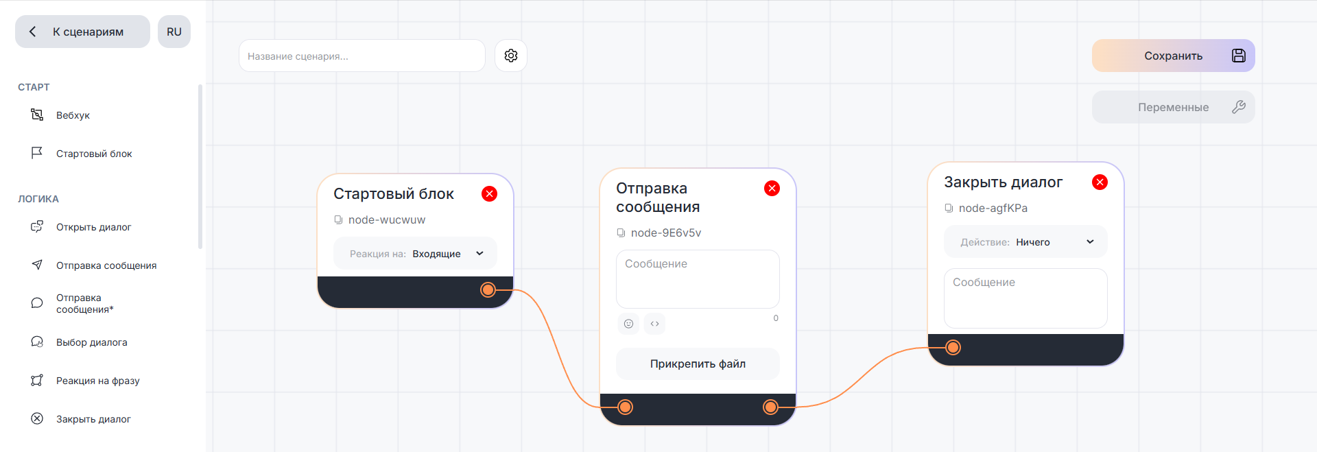 Вы можете сохранить сценарий нажав на «Сохранить» в правом верхнем углу. Какие правила нужно соблюдать, чтобы сценарий сохранился — читайте в статье «Правила сохранения сценария«. Если операция прошла успешно, то внизу справа вы увидите уведомление о сохранении, если нет — об ошибке.