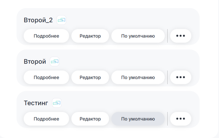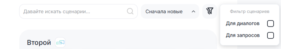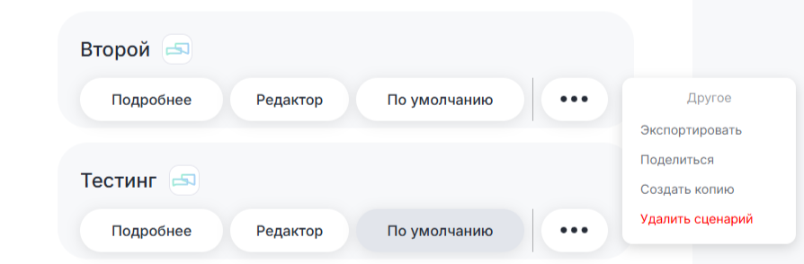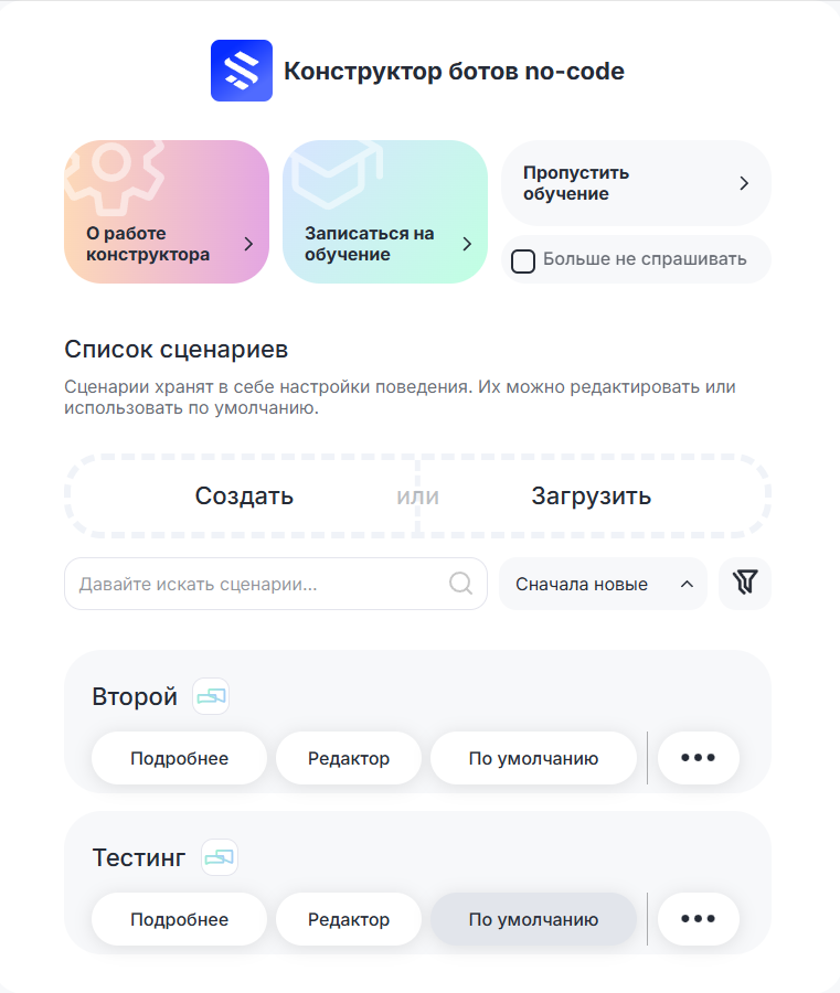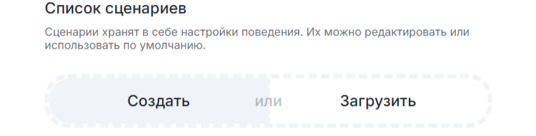 Перед вами откроется список сценариев. Можно сохранить столько сценариев, сколько вам необходимо. Из диалоговых сценариев работать будет только один, индикатором его работы будет затемненная кнопка «По умолчанию». Webhook-сценарии могут работать несколько одновременно.