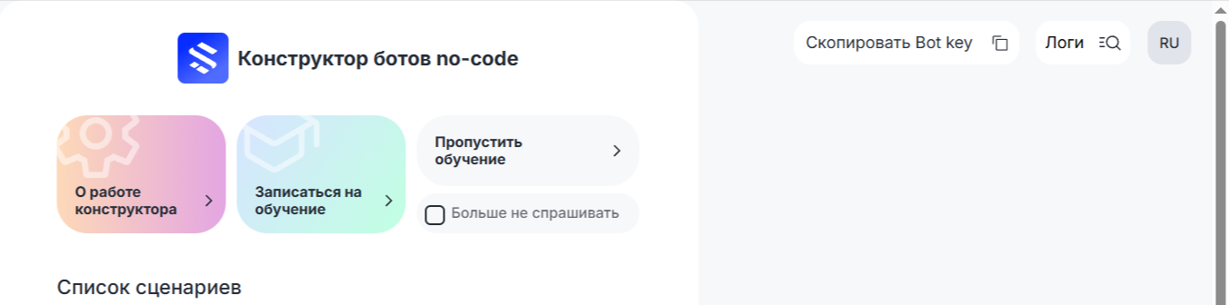 i. В правом верхнем углу меню списка сценариев нажмите на кнопку «Скопировать Bot key».