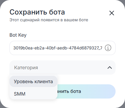 iii. Вставьте ранее скопированный Bot key в поле, задайте категорию и сохраните бот. Без Bot key вы не сможете сохранить посторонний сценарий.