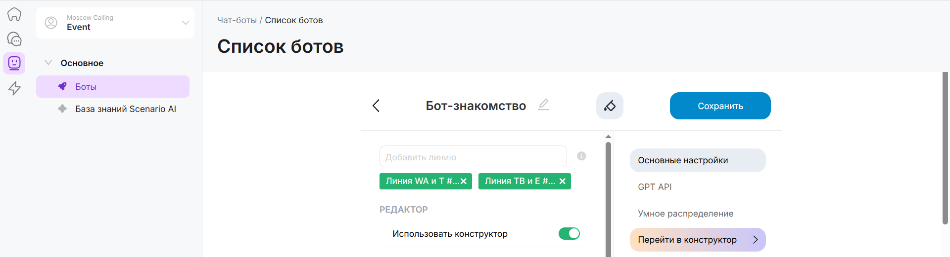 1. После создания и сохранения сценария, вернитесь в Список ботов, нажав на кнопку «Редактор».