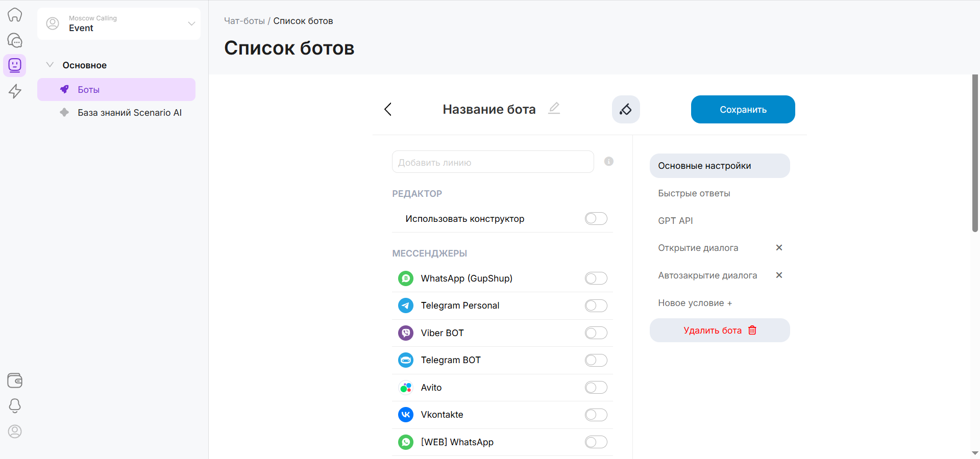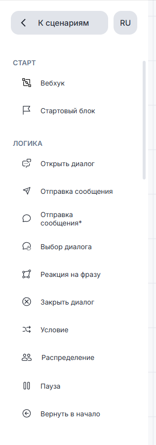 В боковом меню слева находятся блоки, из которых будет состоять сценарий — цепочка действий, выполняемых ботом.