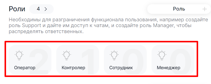 Поставьте ползунки как указано на скриншоте, чтобы сотрудник видел аналитику чатов и данные о компании.
