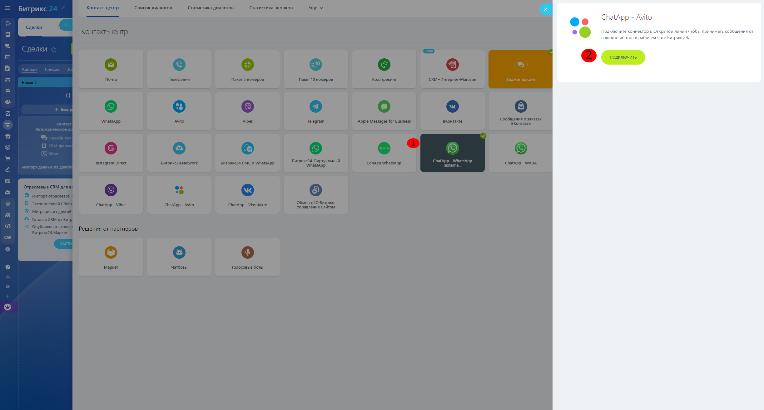 1. В разделе Контакт-центр на платформе Битрикс24, нажмите на коннектор — ChatApp — Avito.