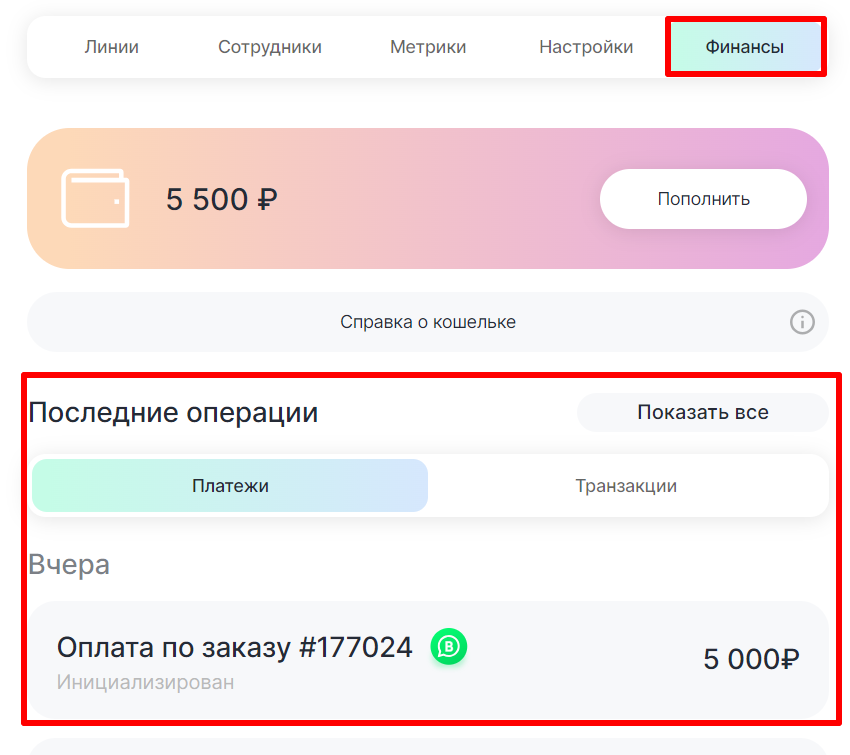 3. Перейдите в раздел «Финансы» → «Последние операции»: