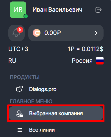 1. Зайдите в Личный кабинет ChatApp → «Выбранная компания».