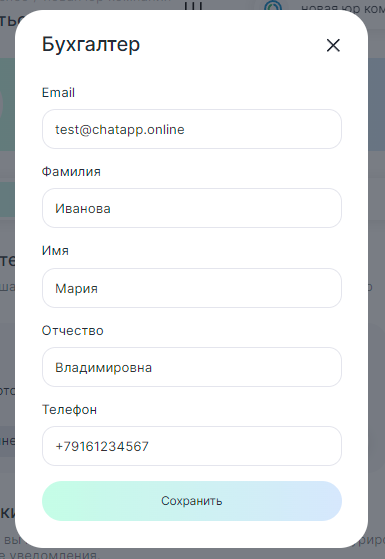 • В «Данные бухгалтера» введите информацию о бухгалтере. Например, если нужно получать счета на его почту.