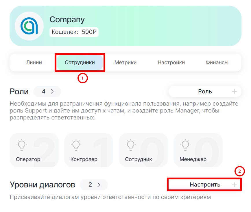 2. Во вкладке «Сотрудники» перейдите в настройку уровней диалогов;