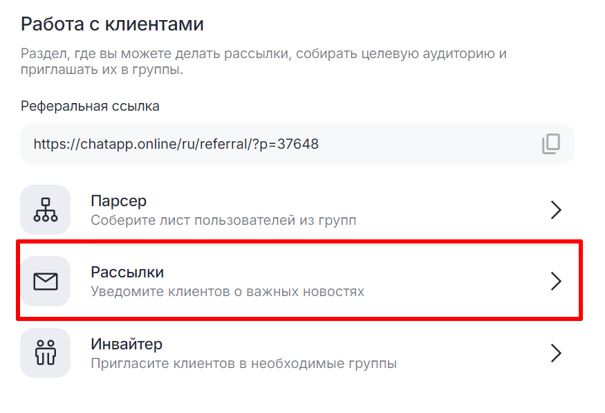 3. Нажмите на иконку письма, чтобы создать новую рассылку.